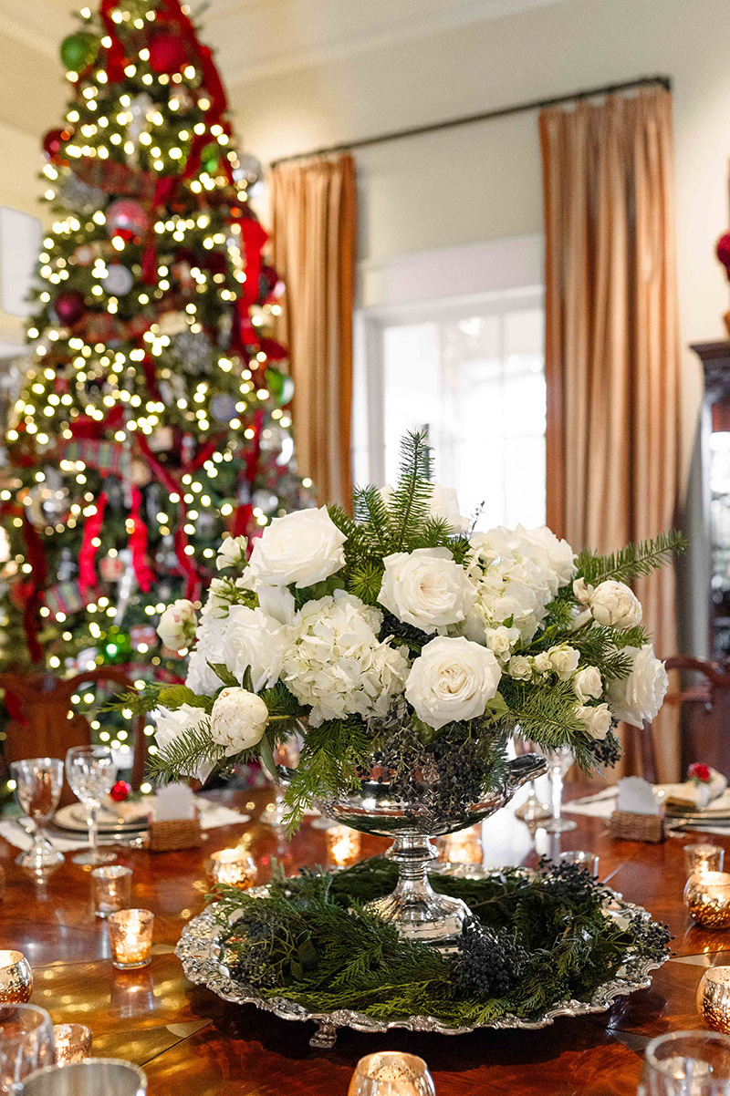 In the center of the dining room’s main round table, Cook started with the homeowners’ silver urn and tray and created an arrangement of white flowers including peonies, hibiscus, spray roses, garden roses, and ranunculus, along with juniper berries and holiday greenery. These details played off the greenery that lined the room’s fireplace mantel and the tall Christmas tree that stood in one corner. To decorate the tree, Cook used the homeowners’ existing collections of ornaments and carried out the red holiday motif with cascading ribbons and bows.