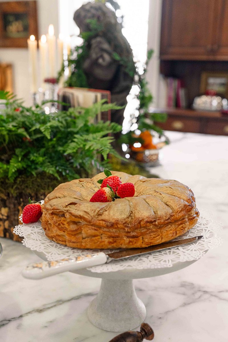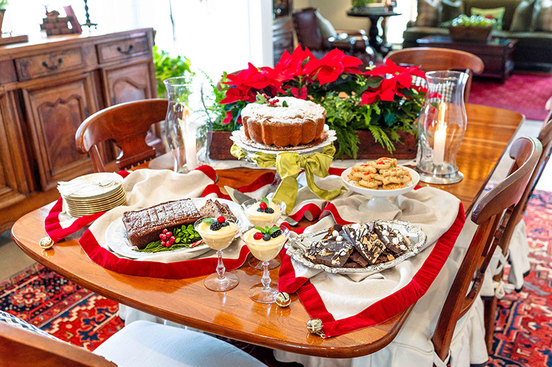 After the seated dinner, guests enjoyed an elaborate spread of holiday desserts including one of the homeowners’ favorite local desserts, the almond pithivier from Fleur de Lis Bakery in Gulfport. Other sweet treats, served from the breakfast table, included an old-fashioned gingerbread cake, s’mores-inspired chocolate toffee bark, an apple spiced Bundt cake topped with confectioners’ sugar snow, and a platter piled high with holiday sugar cookies. Rounding out the dessert selections were vanilla bean custard served in etched stemmed glasses, as well as chocolate-covered dates stuffed with almond butter. Here and elsewhere in the house, Cook placed red poinsettias and maidenhair ferns to complete the classic look.