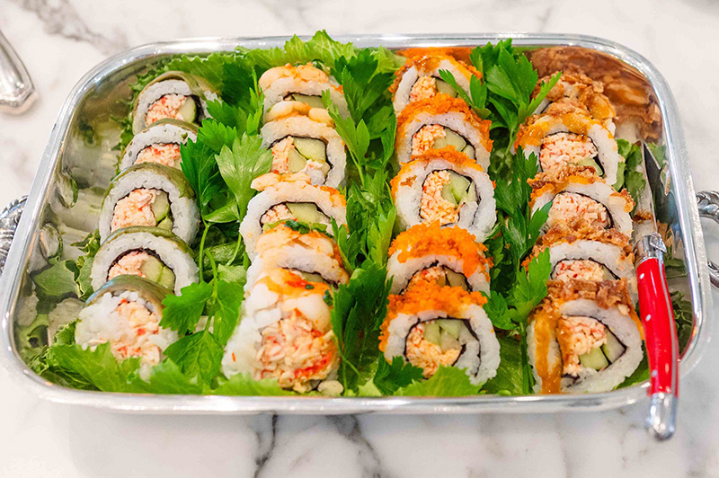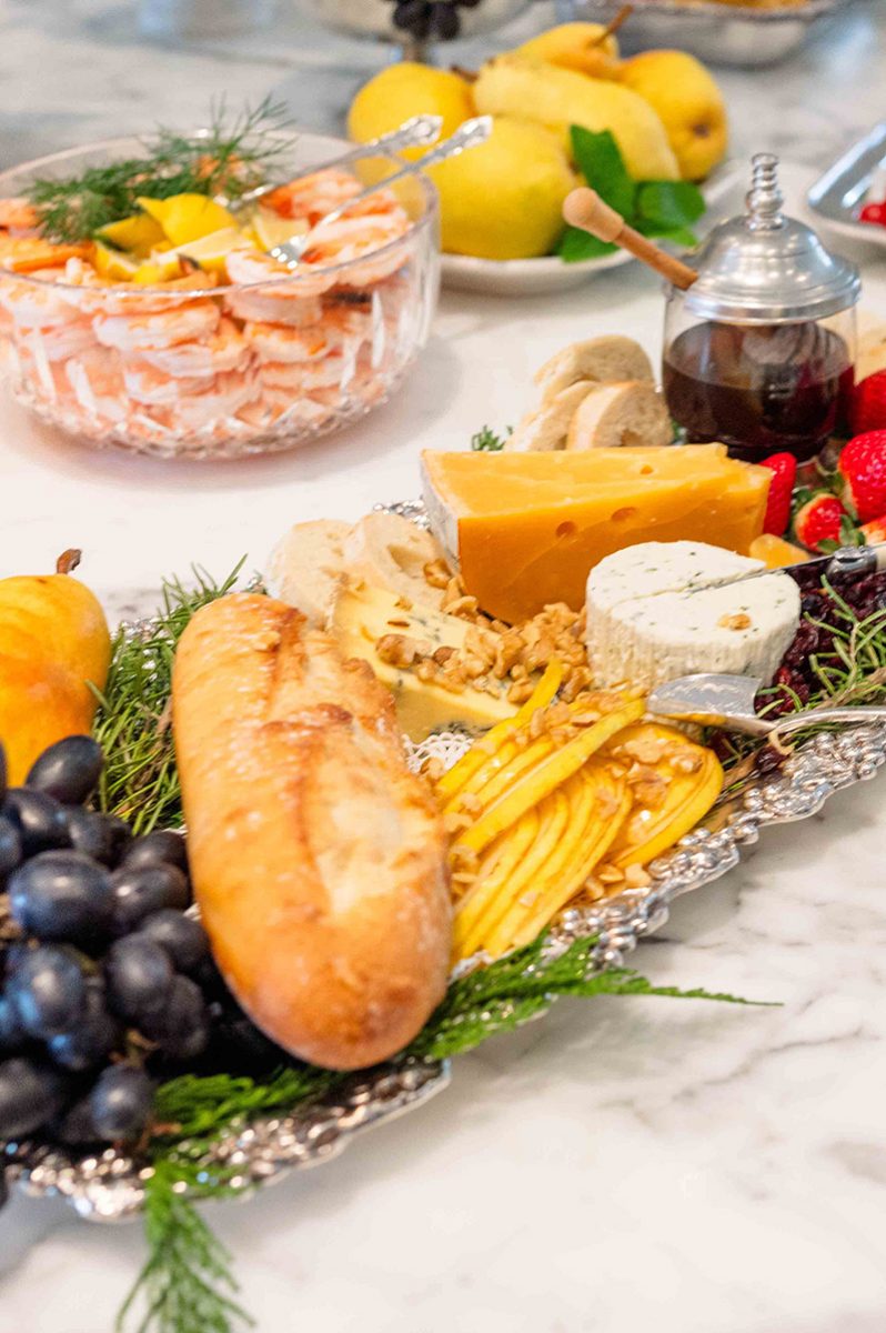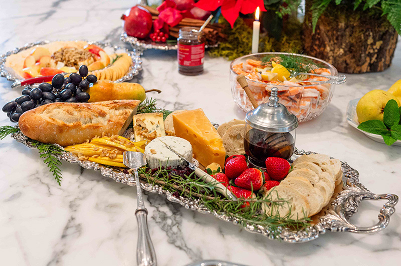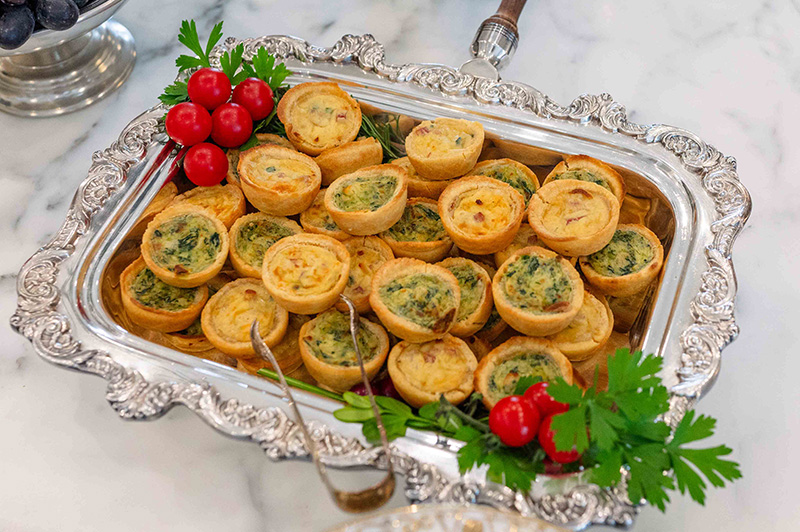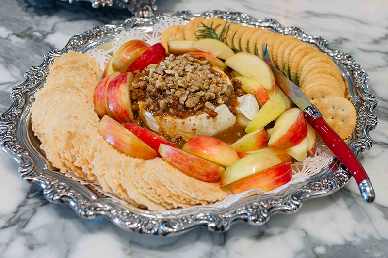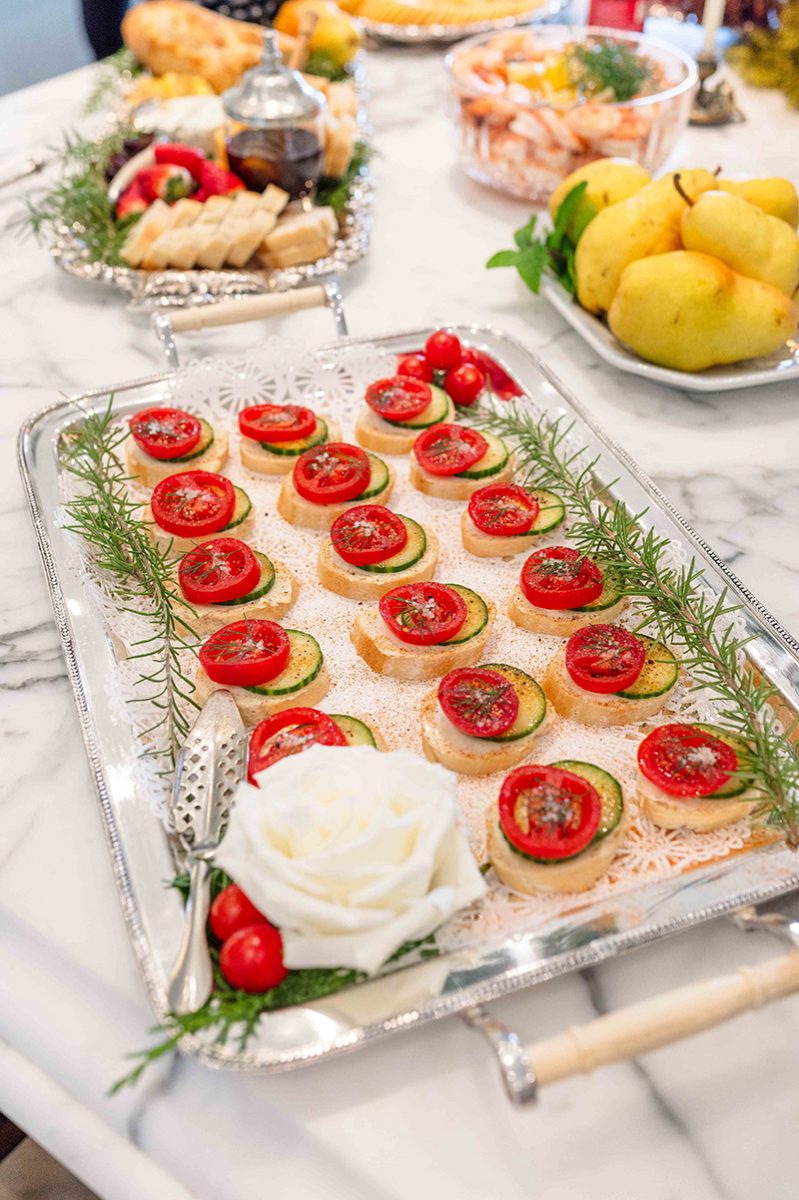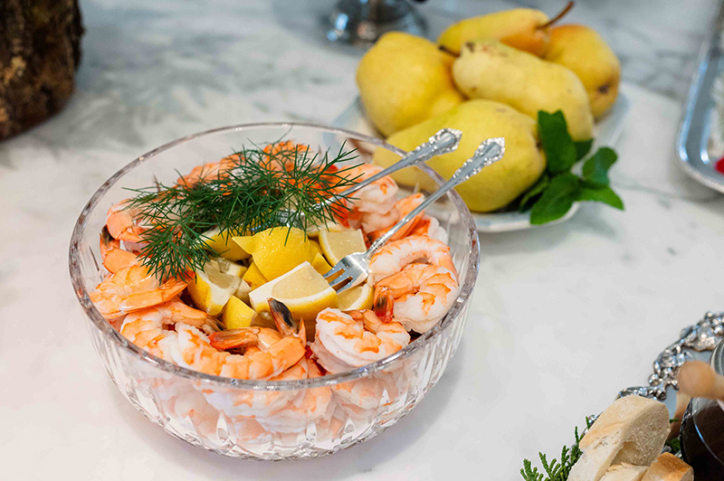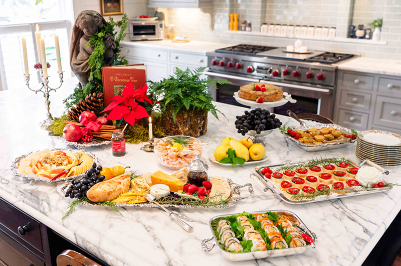 The menu for the party began with an array of hors d’oeuvres set out on the kitchen island. These included tomato tartines, pickled Gulf shrimp, baked Brie with fig jam, miniature quiches, a cheese and fruit board, and sushi rolls created by a favorite local sushi chef. Accompanying these savory goodies were holiday-scented citrus cocktails served from a glass beverage dispenser adorned with a simple red bow and surrounded by cinnamon sticks and orange slices.