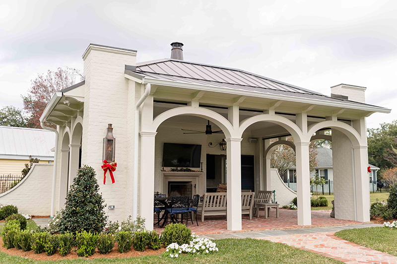 Just as the structure is decorated with traditionally minded furniture and décor year round, the homeowners sought a timeless style for this holiday party. They called on Ginger Cook of Ginger Cook Design in Diamondhead to set a scene that reflected their classical aesthetic. Cook, whose work ranges from wedding planning and large event coordination to interior consulting and floral design, combined her own special touches with a number of treasured items already in the homeowners’ possession.