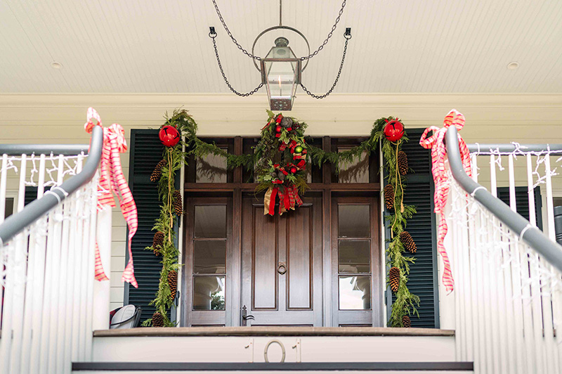 But the festive touches for this celebration began out front, where the railing of the wrought iron fence was wrapped in fresh garlands and white lights. As guests walked along the brick-paved path and up the stairs to the second story, they were greeted by red and gold ribbons on the newel posts and large wreaths hung on the balcony rails. The front door was swagged in fresh garlands accented with pinecones, oversized red jingle bells, and a central wreath featuring a variety of red and gold ribbons.