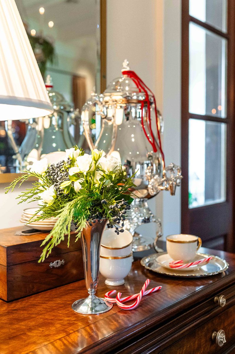 “They have such a beautiful style and such good taste,” Cook says. “I love to accessorize and pull together a party look for them using the pieces they already have. It’s a dream to be able to work in a house with all of these gorgeous antiques and then to walk outside and be able to clip rosemary and boxwood. I really enjoyed helping to bring their vision to life.”