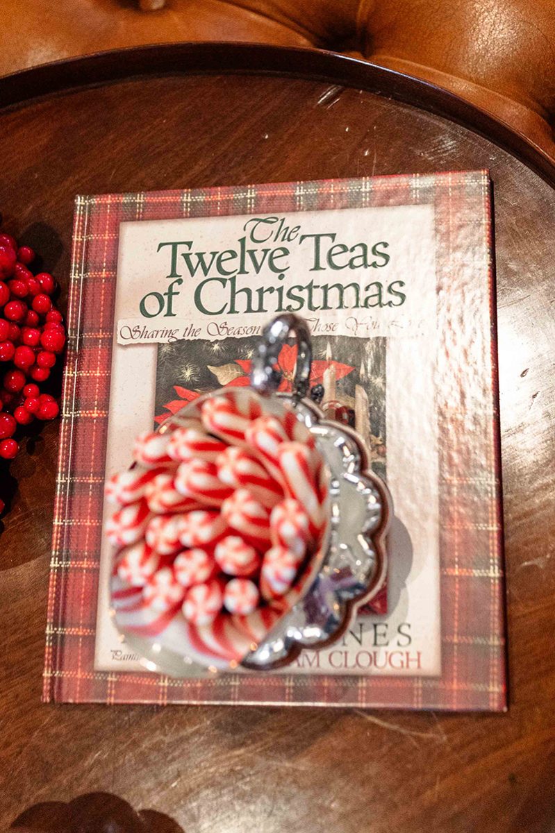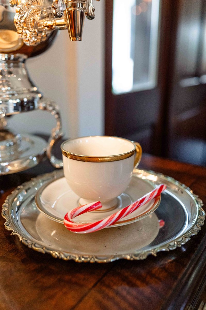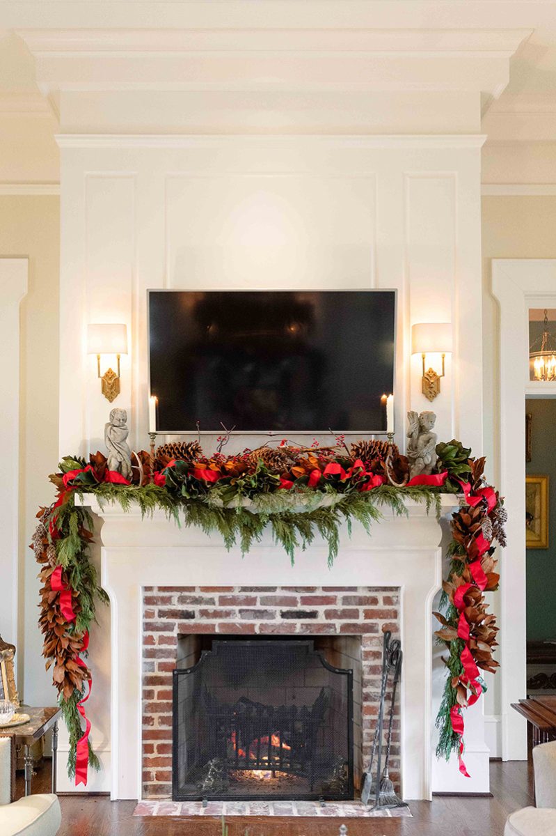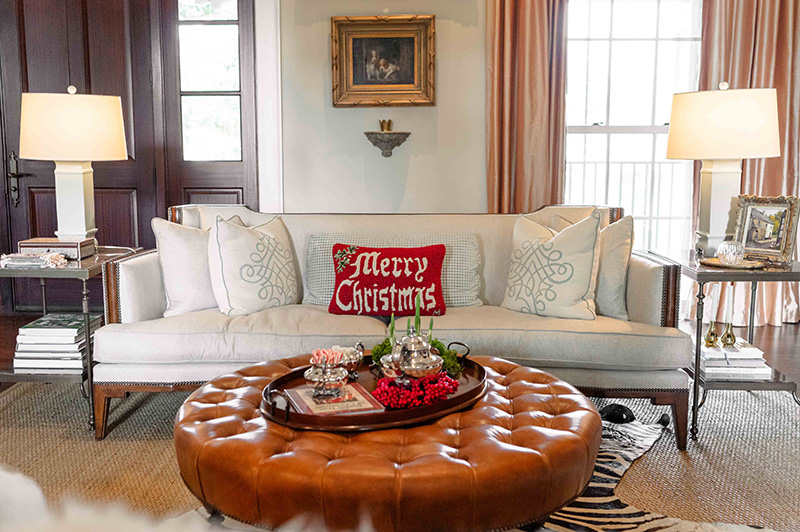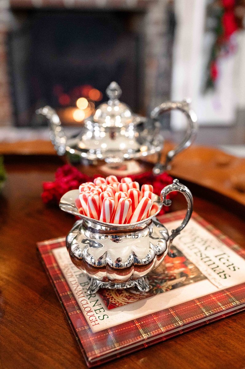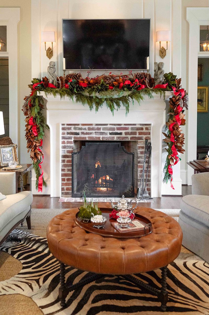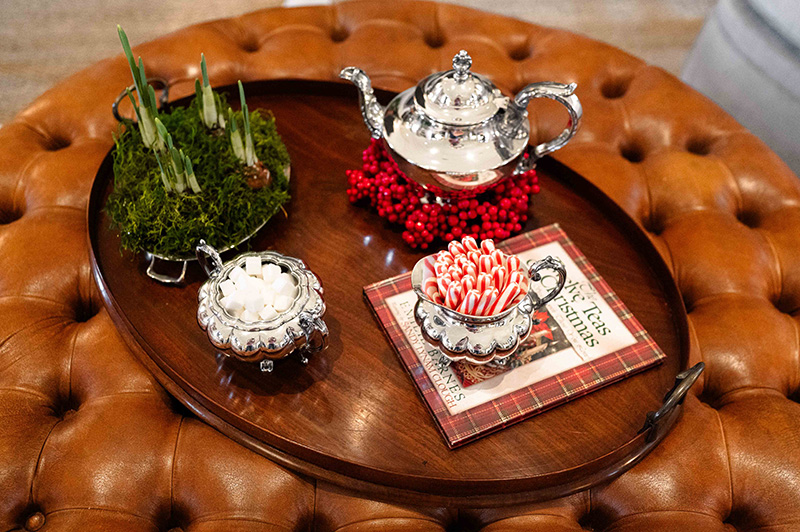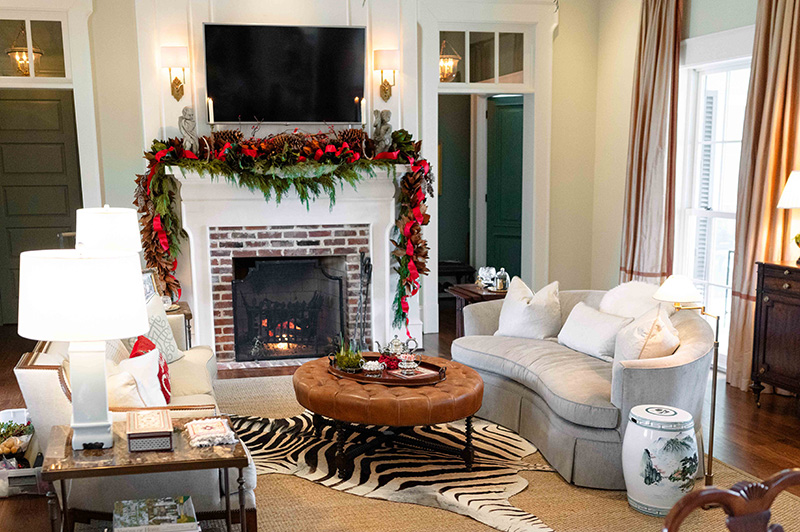 The sitting area located opposite the dining room in the home’s large front public space had its own fireplace for Cook to decorate, which she did with multi-layered fresh and dried garland swags and red ribbons. At each end of the mantel, she placed a cherub statue and a lit candle. The sofas in this room were adorned with holiday pillows, and the tufted leather ottoman was the perfect spot to place a silver tea service complete with candy canes.