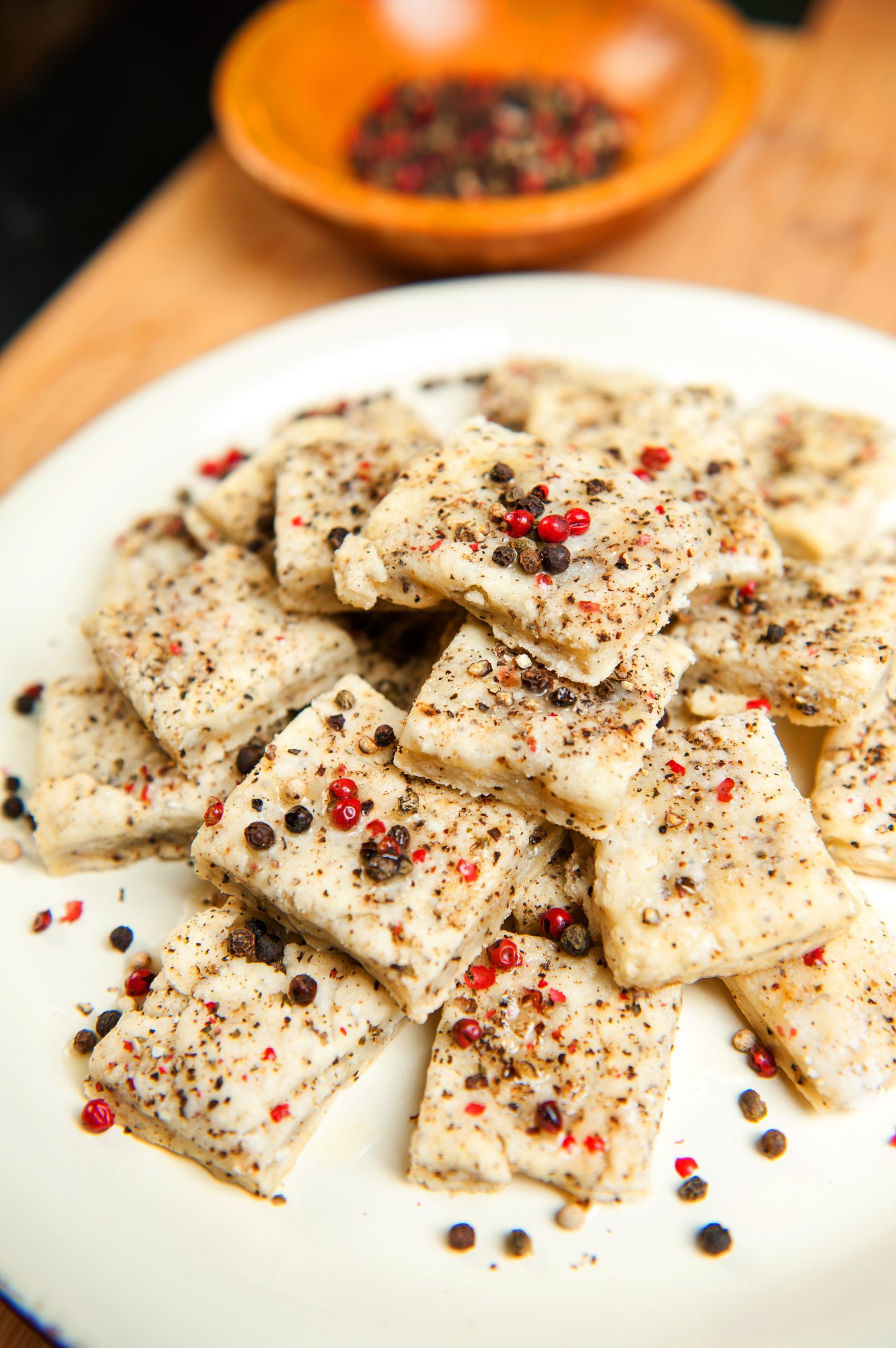 Preheat oven to 500 degrees. In a large bowl, measure flour. Mix in two tablespoons of ground, mixed peppercorns. Using your fingers or a pastry cutter, incorporate cubed butter and cream cheese until mixture resembles cottage cheese. It will be chunky with loose flour. Make a well in center. Pour in buttermilk and using your hands, mix flour into buttermilk. Dough will be wet and sticky. Sprinkle flour on top of dough. Run a spatula around inside of bowl, creating a separation between dough and bowl. Sprinkle a bit more flour in the crease. Flour a work surface very well. Dump dough onto floured surface. Flour top of bowl and rolling pin. Roll dough to ½-inch thickness handling dough as little as possible. Cut biscuits into 1½ -inch squares and place on a parchment-lined baking pan close enough together that they are touching. Brush tops of biscuits with melted butter and sprinkle with salt and mixed peppercorn toppings. Place baking pan in oven and immediately reduce temperature to 450 degrees, Bake 16 to 18 minutes or until light brown on top, rotating pan once while baking. Remove pan from oven and serve warm.