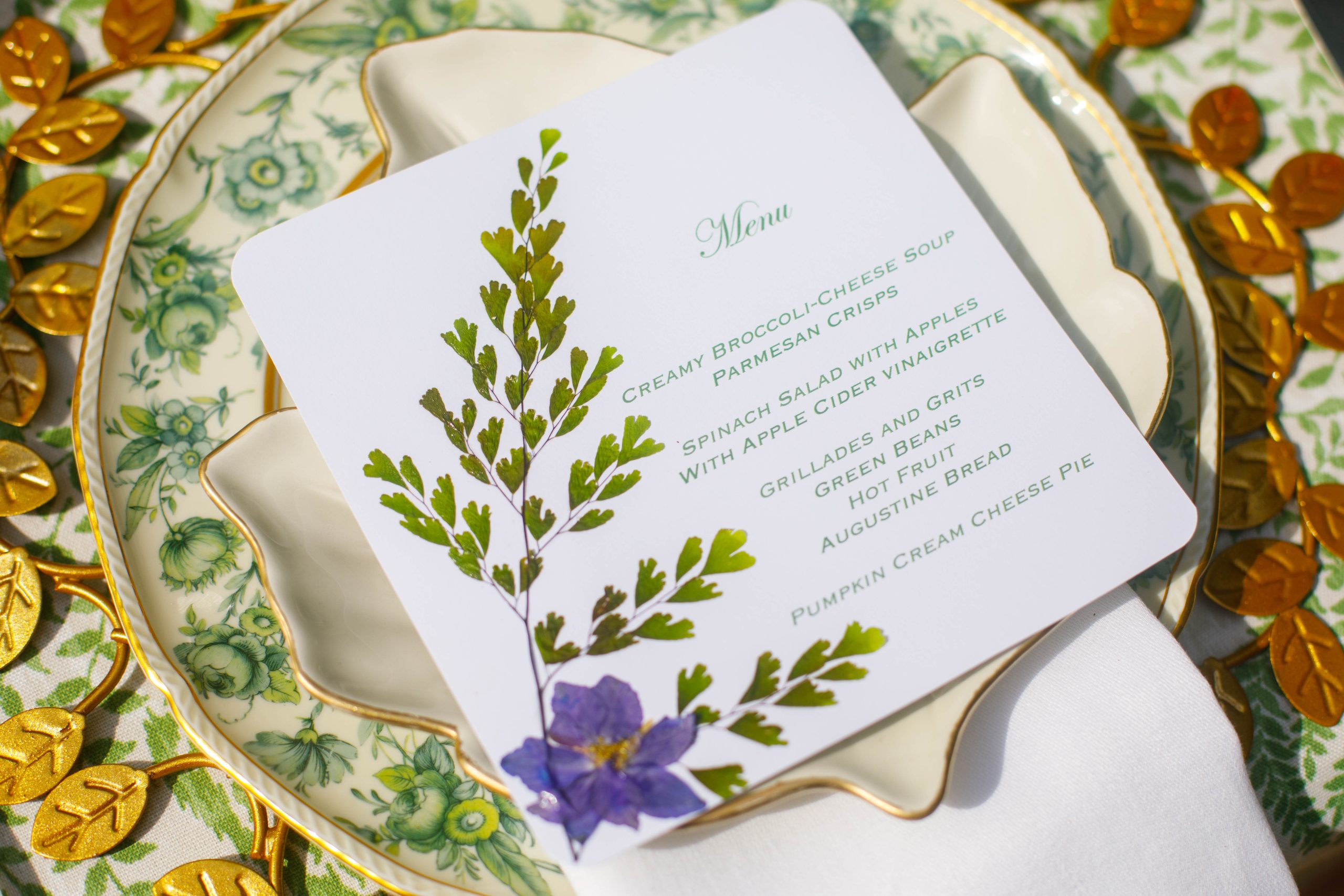To create floral menu cards, print menu on cardstock paper allowing space for ferns and flowers. Attach a small fern and flower to each printed menu card with Mod Podge. Allow drying time.