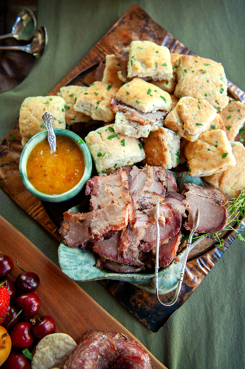 Cracked Pepper and Chive Biscuits with Beef Brisket and Jezebel Sauce