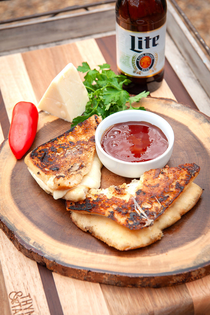 This grilled cheese has a nice twist—not only with the addition of the hot honey, but it is grilled inside out.