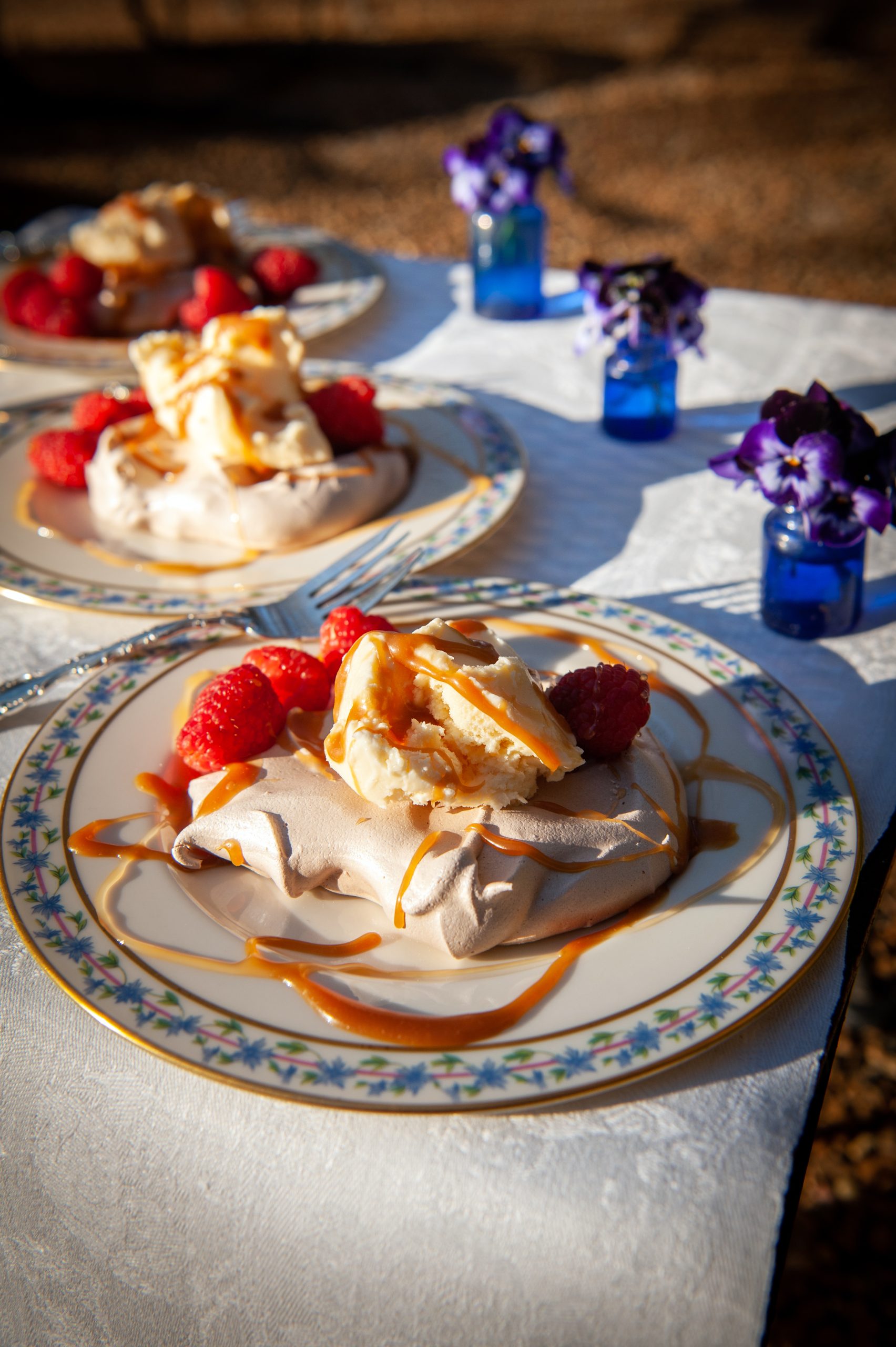 To assemble, place 1 meringue on each dessert plate and pour 2 to 3 tablespoons caramel over meringue. Top meringues with whipped cream and fresh raspberries. Serve immediately.